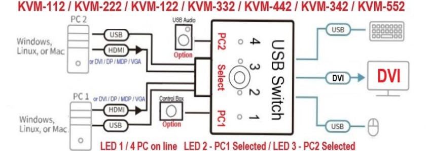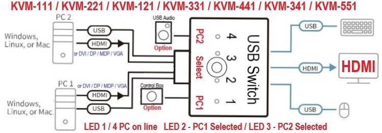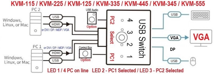| All Audio are USB to Audio converter: For Window & MAC / KVM-XXX Body with Select push bottom & LED Display PC link & PC selected. | |||||