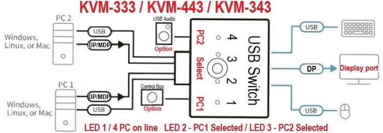 | All Audio are USB to Audio converter: For Window & MAC / KVM-XXX Body with Select push bottom & LED Display PC link & PC selected. | |||||